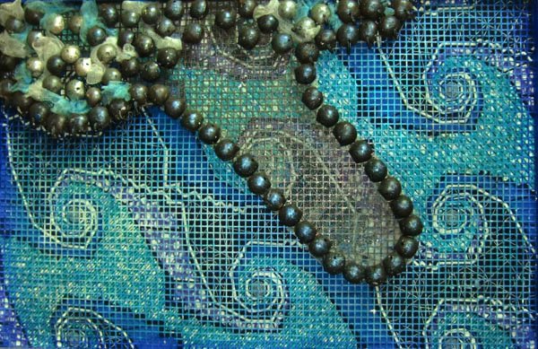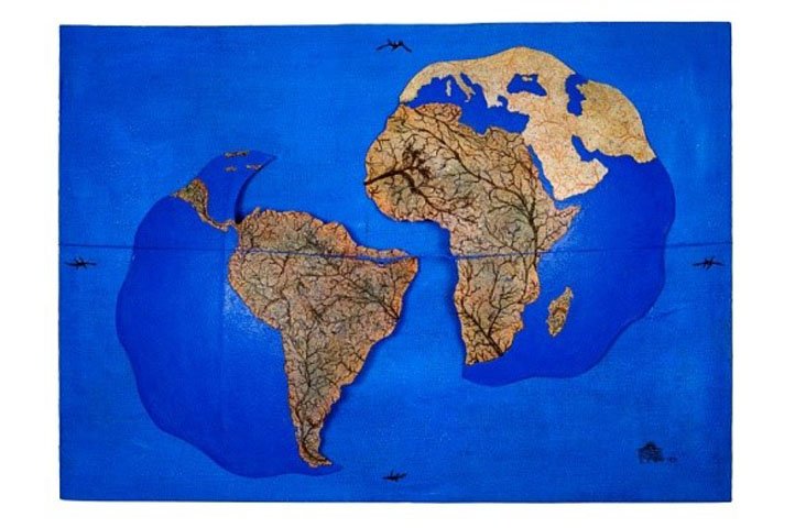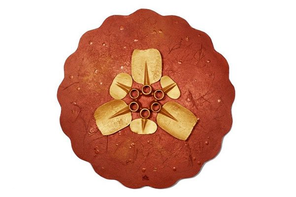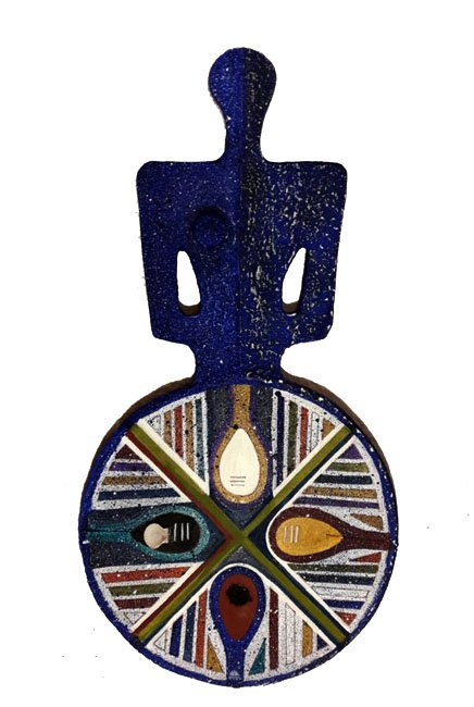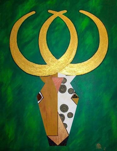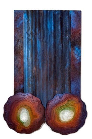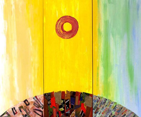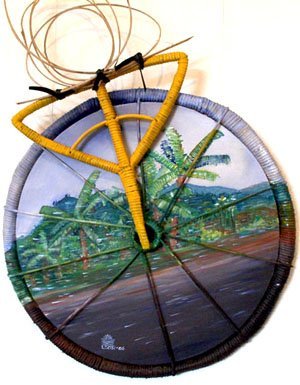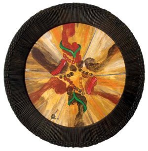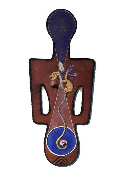 Mixta: acrílico/ corteza de ficus, pulseras tradicionales, metal. 77 x 154 cm. |
