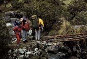 ![]() Cruzando uno de los puentes del camino que atraviesan el río Takesi. |